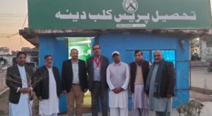 طارق ڈار ایم بی ای میئر اف برینٹ یو کے, حامد بٹ صدر جہلم فورم لندن ،ہارون افضل صدر جہلم فورم یو کے ہمراہ وفد تحصیل پریس کلب آمد