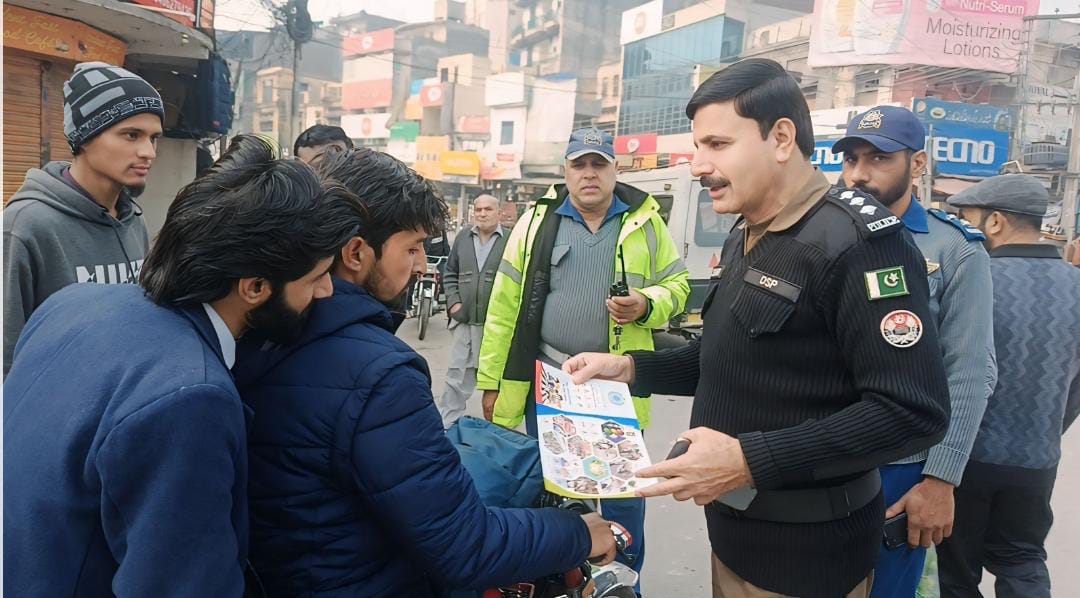 ڈسٹرکٹ پولیس آفیسر جہلم طارق عزیز سندھو کی ہدایت پر ڈی ایس پی ٹریفک طارق شفیع نےشہر میں مختلف شاہراوں پر شہریوں میں ٹریفک آگاہی مہم