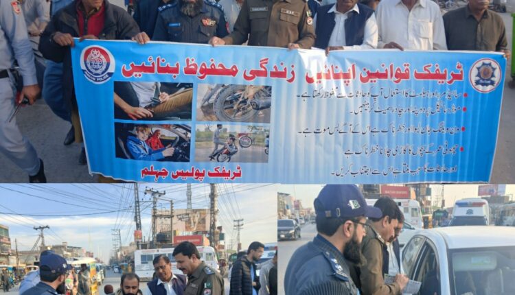 جہلم ( اقبال خان )ایڈیشنل آئی جی ٹریفک پنجاب مرزا فاران بیگ کے ویژن اور ڈسٹرکٹ پولیس آفیسر جہلم طارق عزیز سندھو کی خصوصی ہدایت پر ڈسٹرکٹ ٹریفک آفیسر جہلم طارق شفیع نے ہمراہ فوکل پرسن عبدالغفور چوہان اور انچارج ایجوکیشن ونگ ہارون رشید اور ٹریفک سٹاف کےڈی ایچ کیو جہلم سے جادہ تک ٹریفک آگاہی واک کی واک کا مقصد عوام میں ٹریفک قوانین کے متعلق شعور پیدا کرنا تھا اس کے علاوہ موٹرسائیکل سواروں کو پتنگ کی ڈور سے بچانے کے لئے سیفٹی وائر لگائی گئی اور اس کے علاوہ روڑ یوزر میں آگاہی پمفلٹ تقسیم کئے گئےاس بات پر زور دیا کے موٹرسائیکل پر سوار دونوں افراد ہیلمٹ کا استمال کریں گے تاکہ حادثات سے بچاجا سکےاور ہیلمٹ ہمیشہ پہن کر رکھیں نہ کے موٹر سائیکل پر لٹکا کر رکھیں اور ہمیشہ ٹریفک قوانین کی پاسداری کریں