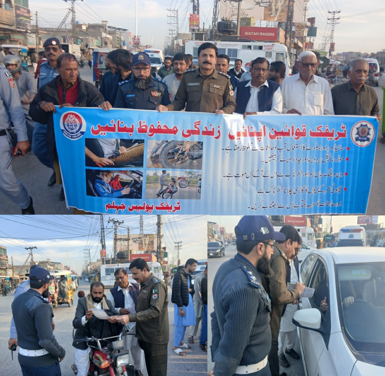 ڈسٹرکٹ پولیس آفیسر جہلم طارق عزیز سندھو کی خصوصی ہدایت پر ڈسٹرکٹ ٹریفک آفیسر جہلم طارق شفیع و ٹریفک سٹاف کےڈی ایچ کیو جہلم سے جادہ تک ٹریفک آگاہی واک