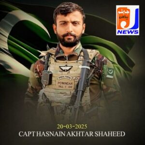 However, during the intense fire exchange, Captain Hasnain Akhtar (age: 24 years, resident of District Jhelum), who was leading his troops from the front, having fought gallantly, paid the ultimate sacrifice and embraced Shahadat.