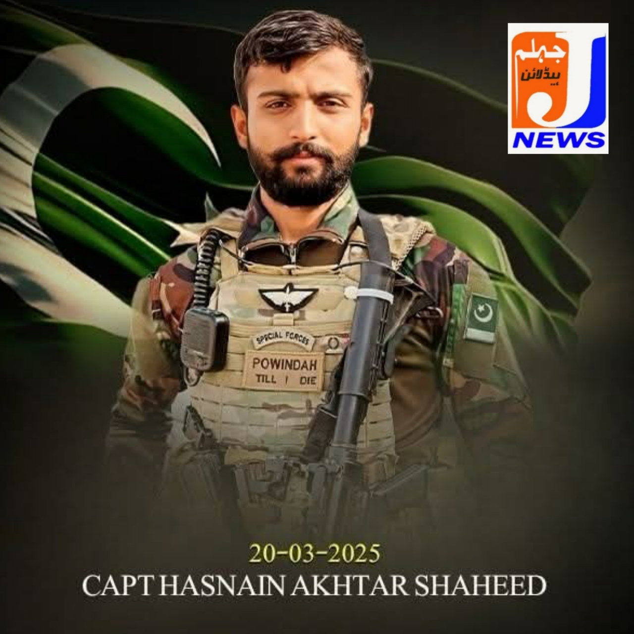 Captain Hasnain Akhtar resident of District Jhelum, who was leading his troops from the front, having fought gallantly, paid the ultimate sacrifice and embraced Shahad