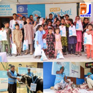 جانوروں کی قربانی کی تقریب سکول اف ایکسیلینس گوجرخان میں منعقد کی گئی جہاں چھ سو سے زائد مستحق گھرانوں میں تین کلو فی کس کےحساب سے قربانی کا گوشت تقسیم کیا گیا
