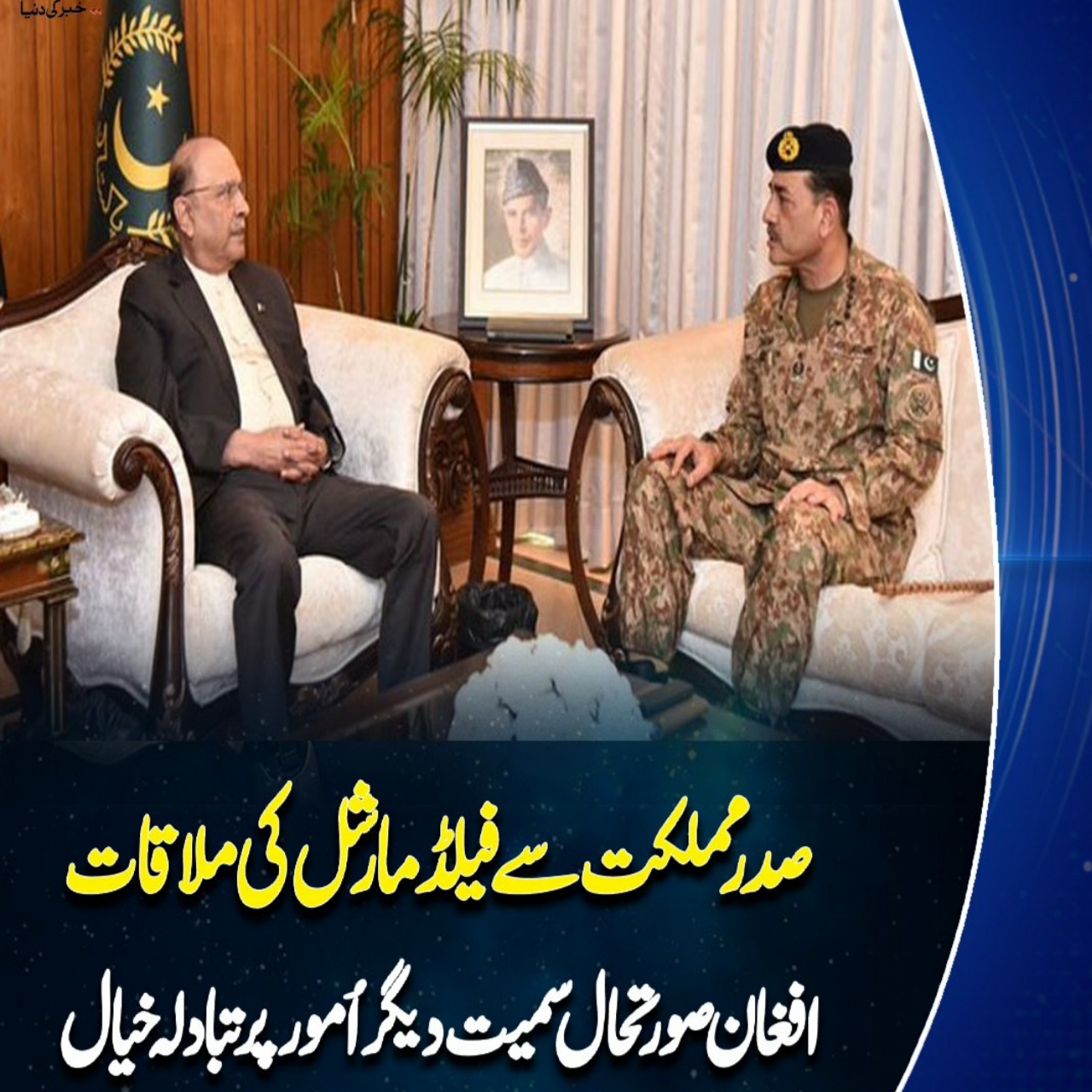 اسلام آباد:صدر مملکت آصف علی زرداری سے فیلڈ مارشل سید عاصم منیر نے ملاقات کی، ملاقات میں افغانستان کی صورتحال، اندرونی اور بیرونی سلامتی کے اُمور پر تبادلہ خیال ہوا۔