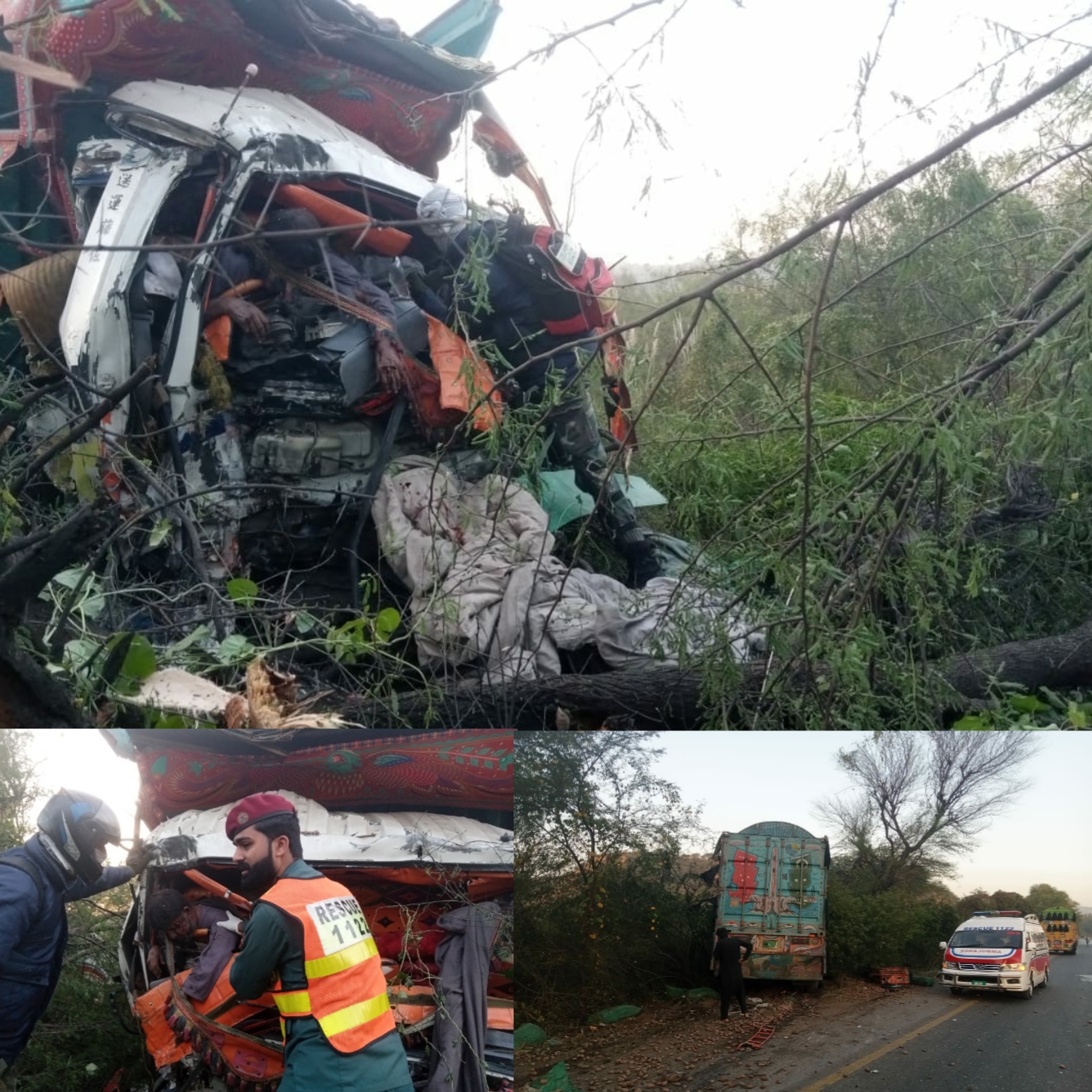 دونوں ٹرک راولپنڈی کی جانب جا رہے تھے کہ ایک ٹرک دوسرے سے ٹکرا کر سڑک سے نیچے جا گرا اور درختوں میں پھنس گیا۔ ٹرک میں تین افراد سوار تھے ۔ ریسکیو ذرائع