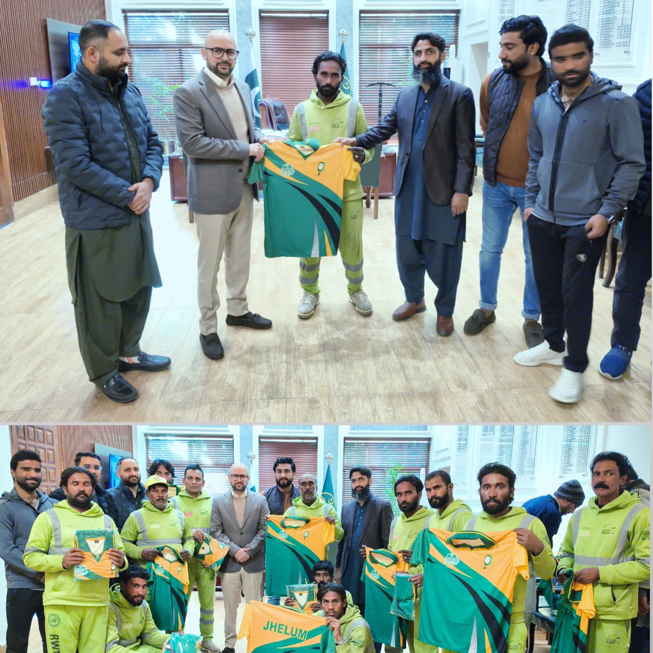 ڈپٹی کمشنر جہلم میر رضا اوزگن نے راولپنڈی ویسٹ مینجمنٹ کمپنی (RWMC) جہلم کے عملے کی حوصلہ افزائی کے لیے ان میں سپورٹس شرٹس تقسیم کیں