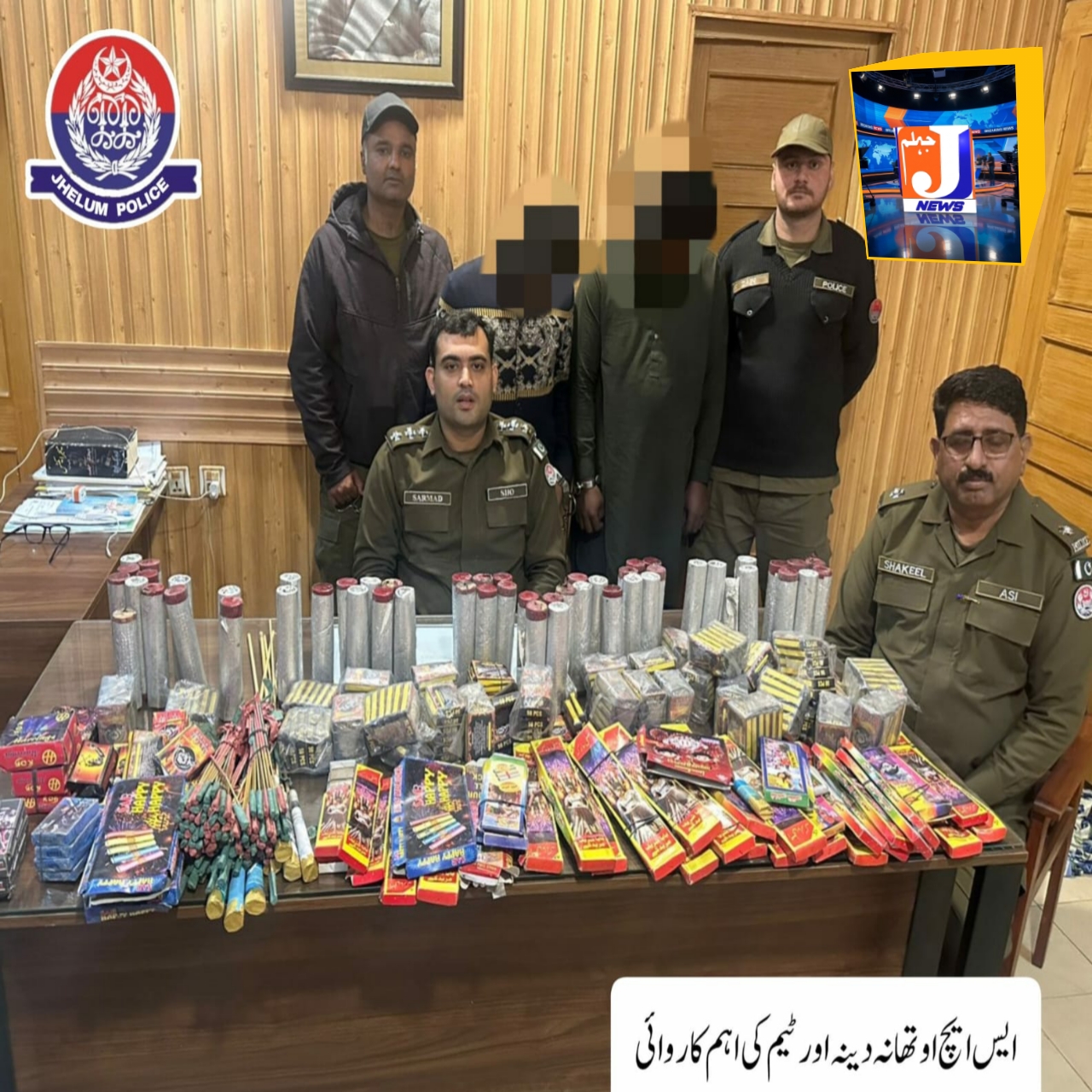 تھانہ دینہ پولیس نے کاروائی کرتے ہوئے ملزمان کو گرفتار کر لیا،ملزمان سے بھاری مقدار میں سامان آتش بازی برآمد کر لیا گیا،ملزم کے خلاف تھانہ دینہ میں مقدمہ درج،