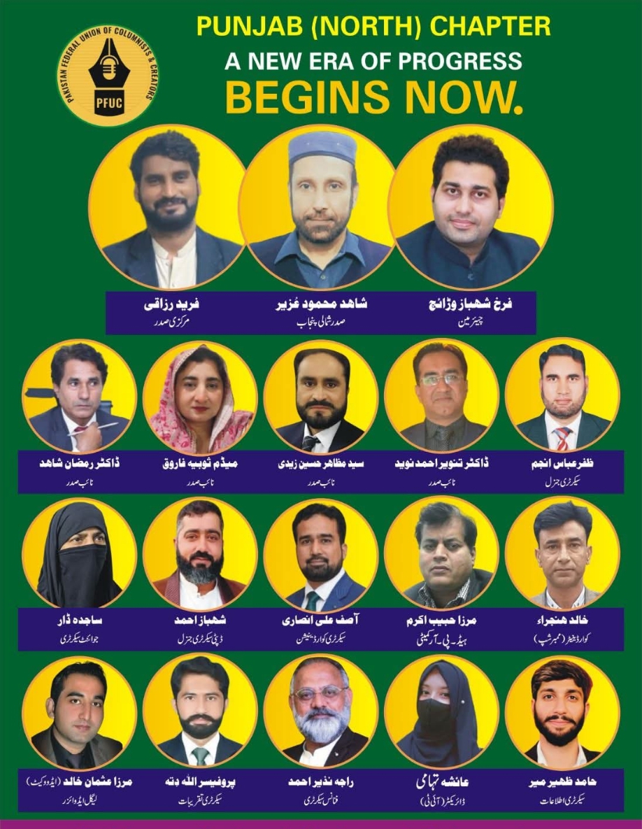 پاکستان فیڈرل یونین آف کالمسٹ اینڈ کرییٹرز (پنجاب شمالی) کے صدر شاہد عزیر نے مرکزی صدر فرید رزاقی سے مشاورت کے بعد پنجاب شمالی کی کابینہ کا باضابطہ اعلان کر دیا